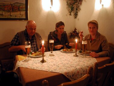 Landpartie-Moderatorin Heike Götz zusammen mit Junior-Chefin Katja Weitemeyer einen zünftigen “Landpartie-Teller” zu. Diesen lassen sich ansc hließend Heike Götz, Hartwig Mühlhausen und Tochter Katja Weitemeyer im Stübchen schmecken. Die Sendung wurde am Sonntag, 9. November 2003, um 20.15 Uhr auf NDR drei ausgestrahlt.